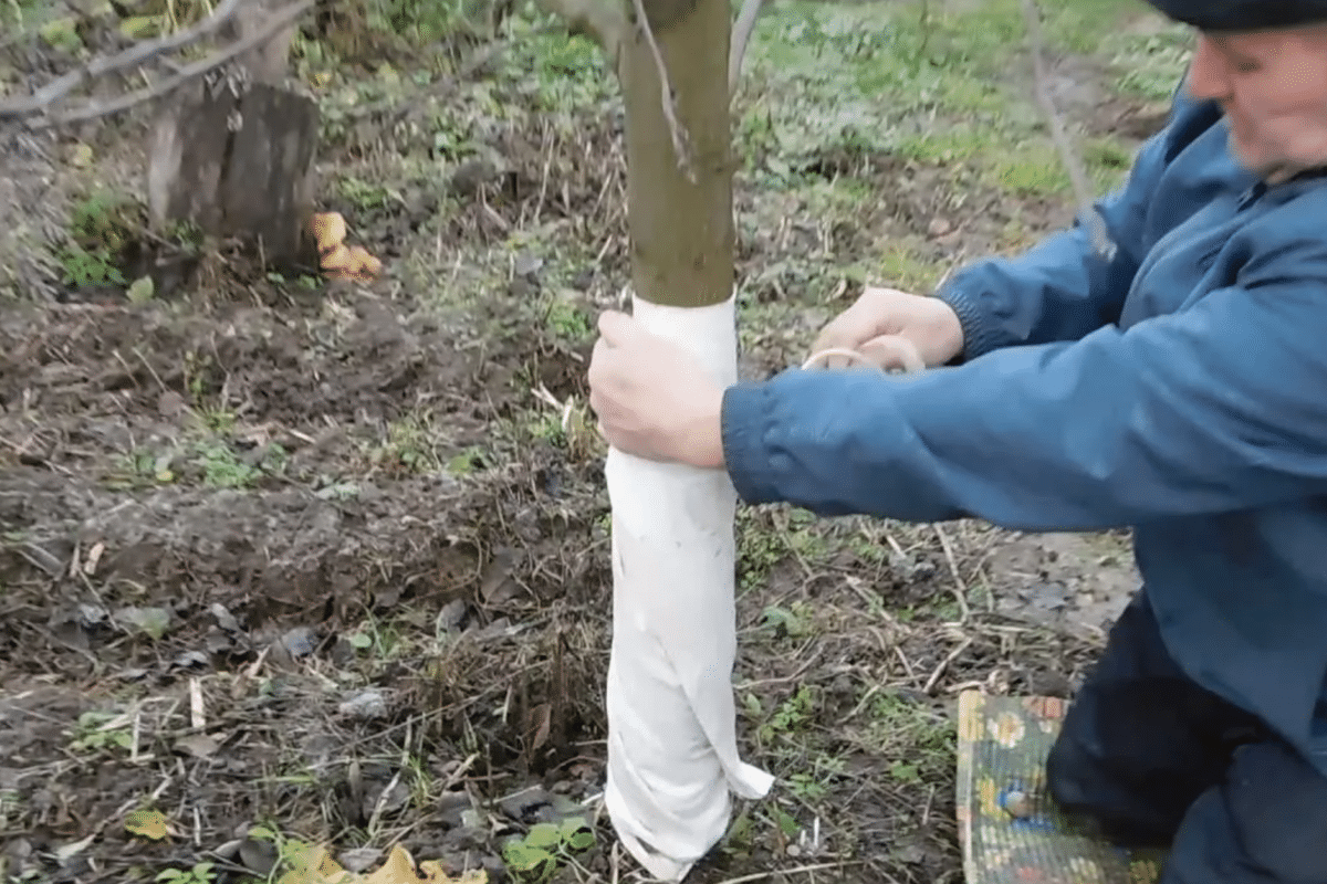 - Оберните стволы молодых деревьев и кустов специальным защитным материалом (белой тканью или специальной пленкой).